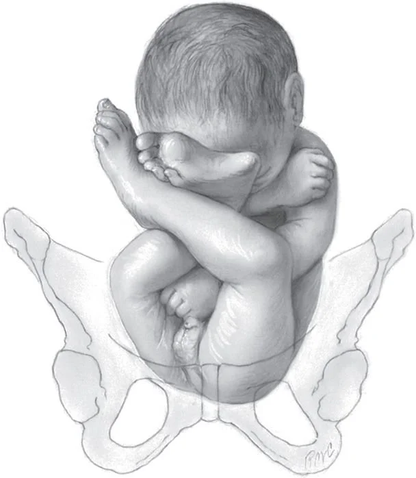 Complete Breech - This is when the baby’s bottom is in the lower uterus near your cervix with their feet tucked, typically like they are sitting criss-cross.